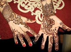 The dye used to create the beautiful designs you see on my cousin's hands, pictured above, is made from dried, ground henna leaves and various other ingredients, which you can investigate further on my recipe page.